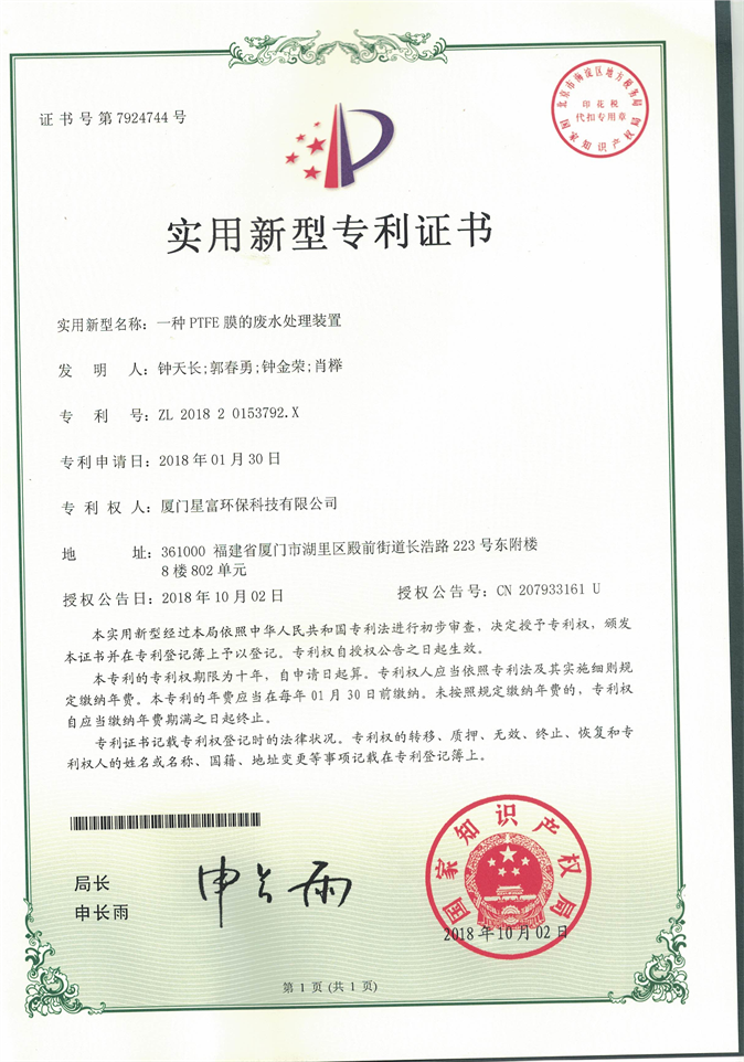 我司關于一體化PTFE-MBR系統(tǒng)污水處理設備已經(jīng)申請相關專利,并取得證書:一種PTFE膜的廢水處理裝置,專利號為ZL 2018 2 0153792.X